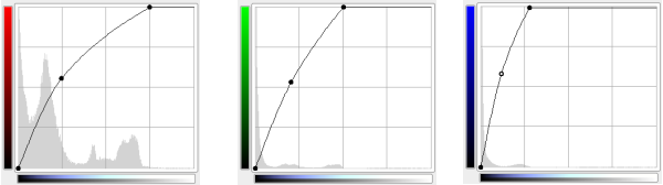 For every channel, we moved the white point horizontally to the left, to the first Highlights. This lightens Highlights up. Then we shaped the curve to lighten Mid tons and Shadows while keeping black.