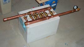 Here are the pictures of the Radiant Heat. PEX-AL-PEX is the pipe used. The one with pipe sticking up is where they will come up out of the concrete. It should have the manifolds in the last picture on them when they're pressure tested. (01/27/01)